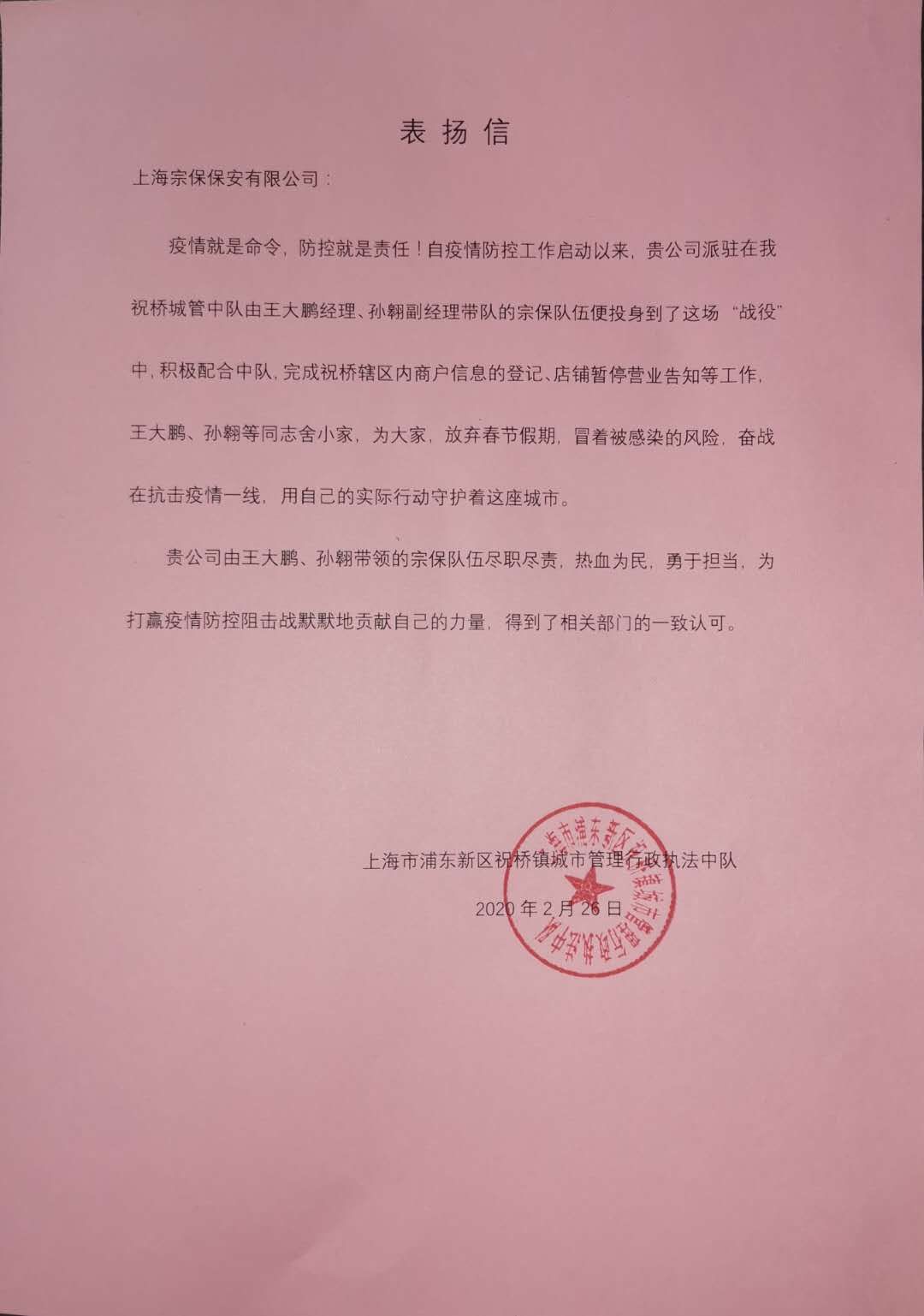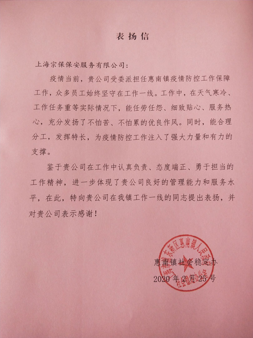 2月25日,浦東新區(qū)惠南鎮(zhèn)穩(wěn)定辦送來(lái)表?yè)P(yáng)信,表?yè)P(yáng)宗保公司駐惠南市容項(xiàng)目全體隊(duì)員在疫情防控中認(rèn)真負(fù)責(zé)、態(tài)度端正、勇于承擔(dān)的工作精神。