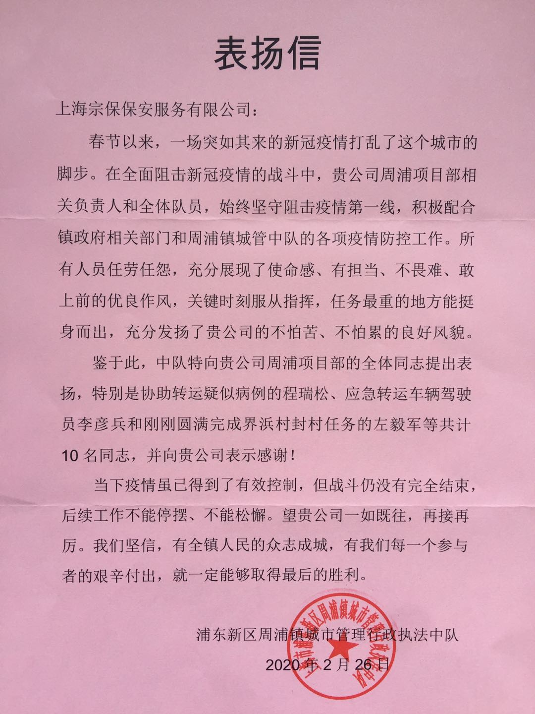 2月26日,浦東新區(qū)周浦鎮(zhèn)城管中隊(duì)送來(lái)表?yè)P(yáng)信,表?yè)P(yáng)公司駐周浦市容項(xiàng)目全體隊(duì)員在疫情防控中的工作表現(xiàn),特別對(duì)協(xié)助轉(zhuǎn)運(yùn)疑似病例的程瑞松、應(yīng)急轉(zhuǎn)運(yùn)車輛駕駛員李彥兵、圓滿完成界浜村封村任務(wù)的左毅軍等10名隊(duì)員重點(diǎn)表?yè)P(yáng)。