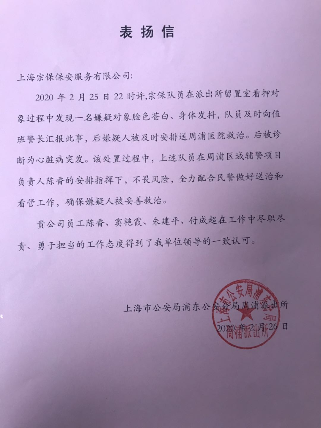 2月26日,浦東公安分局周浦派出所送來(lái)表?yè)P(yáng)信,表?yè)P(yáng)公司駐該所輔警項(xiàng)目陳香、竇艷霞、朱建平、付成超在工作中及時(shí)發(fā)現(xiàn)嫌疑對(duì)象發(fā)病,專業(yè)正確應(yīng)急處置的敬業(yè)精神。