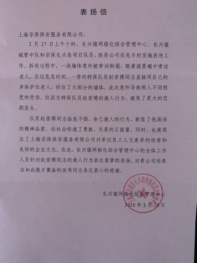 2月28日,宗保公司收到崇明區(qū)長(zhǎng)興鎮(zhèn)網(wǎng)格化管理中心送來(lái)的表?yè)P(yáng)信,高度贊揚(yáng)公司駐長(zhǎng)興島城管項(xiàng)目隊(duì)員趙崇博在拆違過(guò)程中臨危不懼、舍己救人的行為。