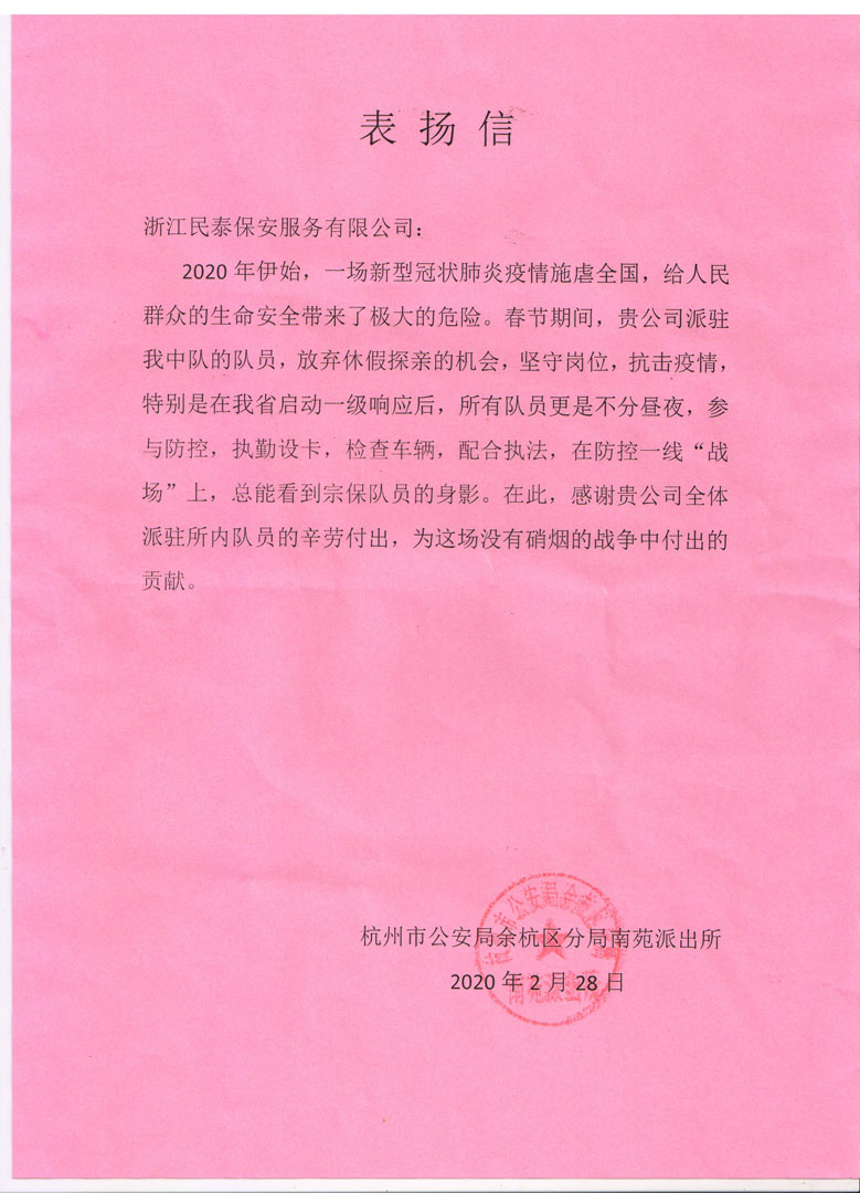 2月28日,浙江民泰公司收到杭州市公安局余杭區(qū)分局南苑派出所送來(lái)的表?yè)P(yáng)信,贊揚(yáng)公司駐該所項(xiàng)目隊(duì)員在疫情防控中的工作表現(xiàn),感謝隊(duì)員們的辛勤付出。