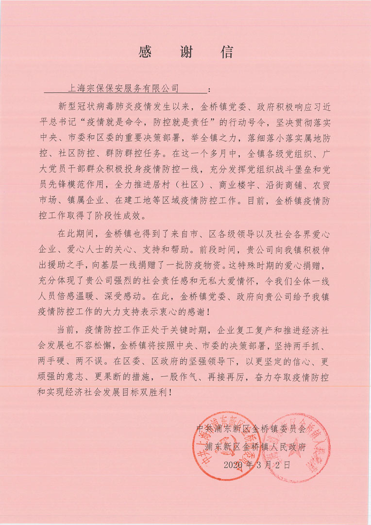王志榮書記對公司的工作給予了充分肯定,宗保公司作為一家專業(yè)配合政府參與城市輔助社會治理的保安公司,能夠堅決貫徹落實區(qū)委、區(qū)政府疫情防控部署要求,嚴格落實疫情防控各項規(guī)定措施。并能在做好員工自身安全防護的前提下,緊密結(jié)合疫情實際,積極配合政府全力投入到疫情防控阻擊戰(zhàn)之中。尤其是在公司做好疫情防控的同時,主動承擔(dān)更多防控責(zé)任,捐款購買疫情防護物資,贈送到疫情防控一線單位,體現(xiàn)了公司的社會責(zé)任感,體現(xiàn)了公司抗擊疫情的擔(dān)當和作為。