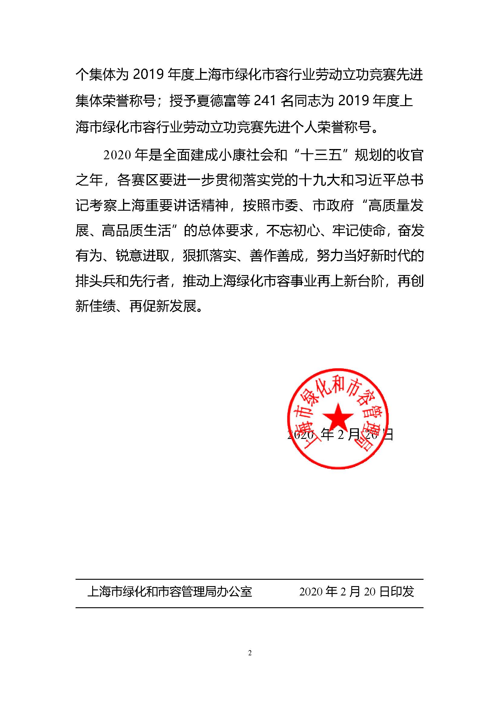 近日,上海市綠化和市容管理局下發(fā)了《關(guān)于表彰2019年度上海市綠化市容行業(yè)勞動(dòng)立功競賽先進(jìn)集體和先進(jìn)個(gè)人的決定》,上海宗保保安服務(wù)有限公司東灘保安隊(duì)被授予“2019年度上海市綠化市容行業(yè)勞動(dòng)立功競賽先進(jìn)集體”榮譽(yù)稱號(hào)。