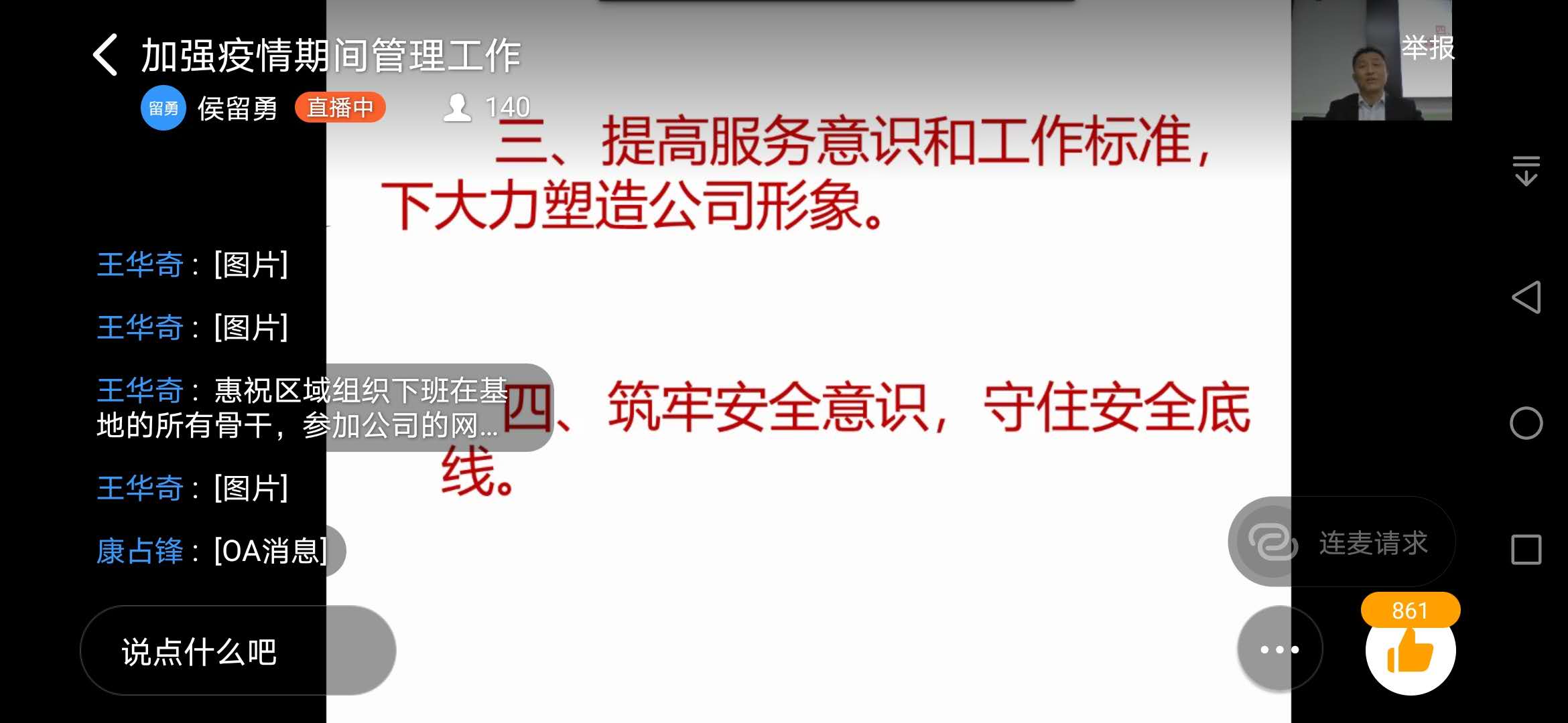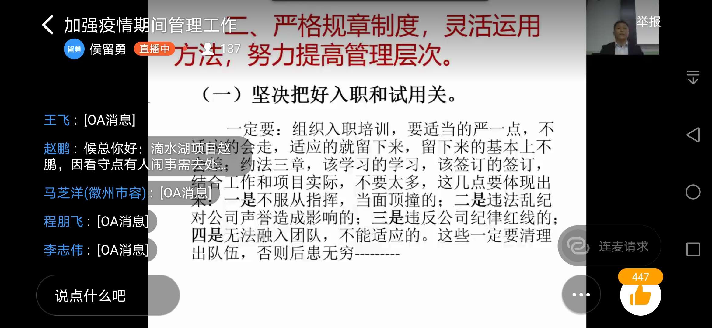 4月3日18點,宗保公司副總經理侯留勇通過釘釘軟件就《如何抓好疫情期間的管理工作》進行線上授課,上海區(qū)域、杭州區(qū)域、黃山區(qū)域的150多名骨干同步聽課。