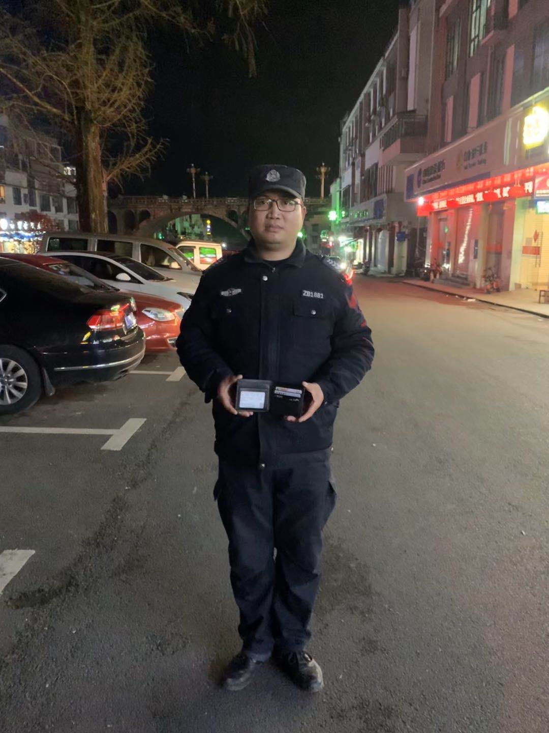 4月1號20:00,宗保公司駐黃山區(qū)域湯口市容項目隊員楊興智在湯口鎮(zhèn)沿溪東街巡邏時撿到一個錢包,內(nèi)有一百元現(xiàn)金一張、銀行卡三張、身份證兩張。