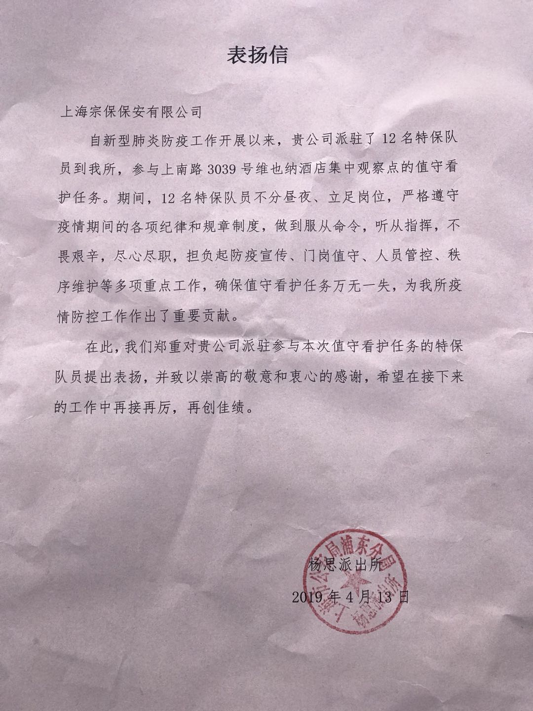 4月13日,宗保公司駐三林鎮(zhèn)市容項目收到楊思派出所送來的一封表揚信,信中對三林鎮(zhèn)市容項目參與XX酒店集中醫(yī)學(xué)觀察點值守看護任務(wù)的宗保隊員提出表揚和感謝。