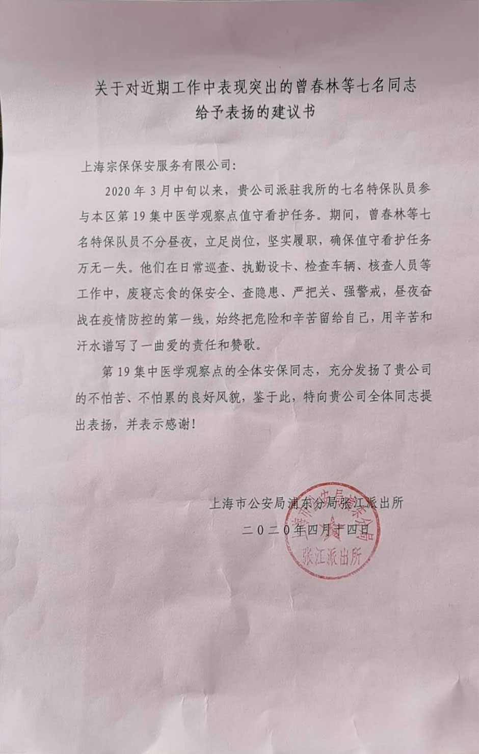 4月14日,宗保公司駐張江派出所輔警項目收到張江出所送來的一封表揚信,信中對該項目參與第19集中醫(yī)學(xué)觀察點值守看護任務(wù)的曾春林等宗保隊員提出表揚和感謝。