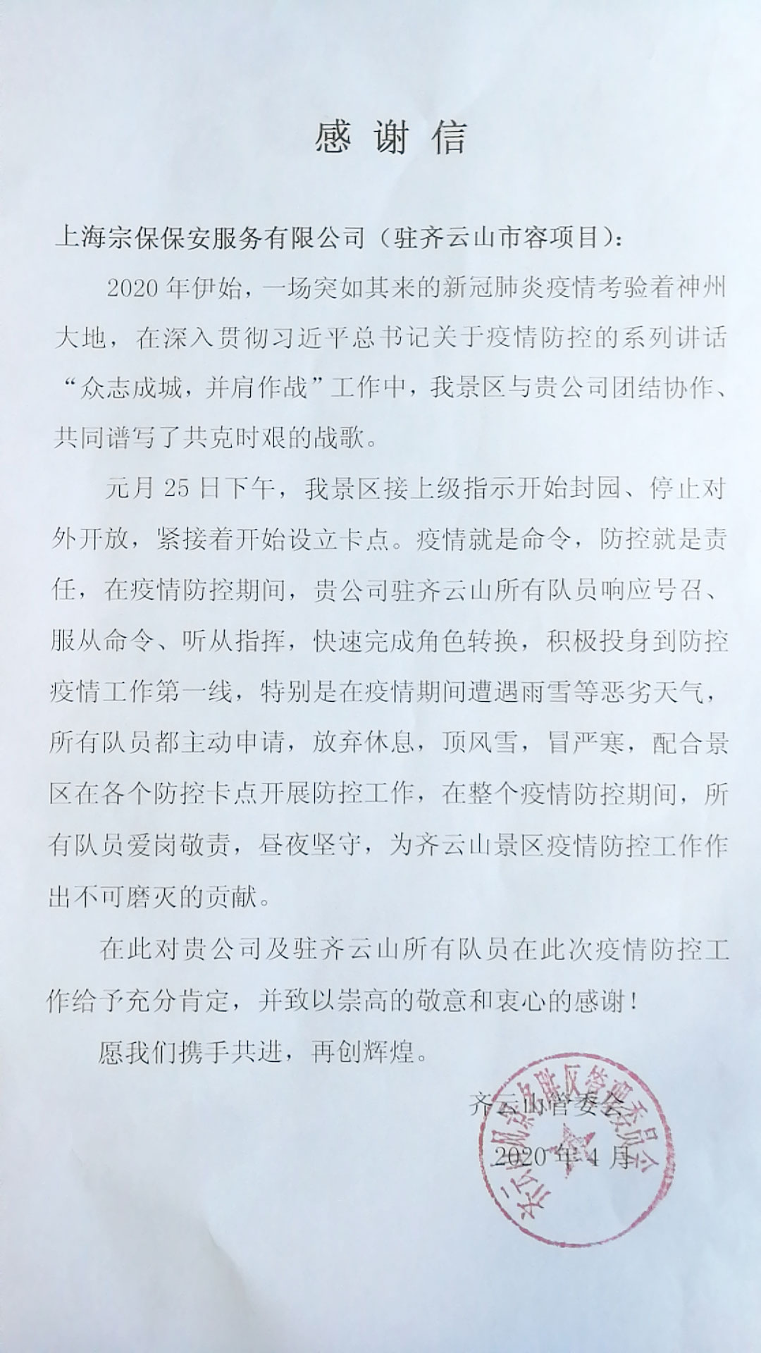 4月16日,宗保公司駐黃山區(qū)域齊云山市容項目收到齊云山管委會的一封感謝信,對在疫情防控期間付出辛勞的宗保隊員們表示肯定和感謝。