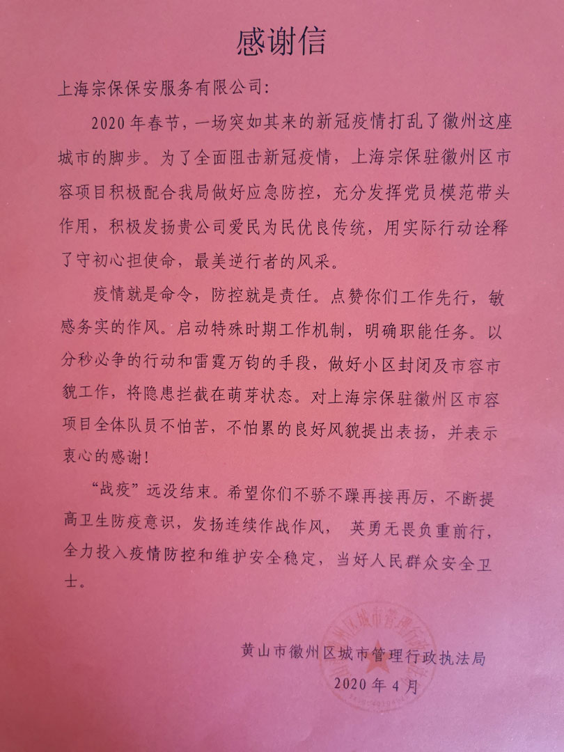 4月16日,宗保公司收到黃山區(qū)城市管理行政執(zhí)法局的一封感謝信,對在疫情防控期間付出辛勞的宗保隊員們表示肯定和感謝。