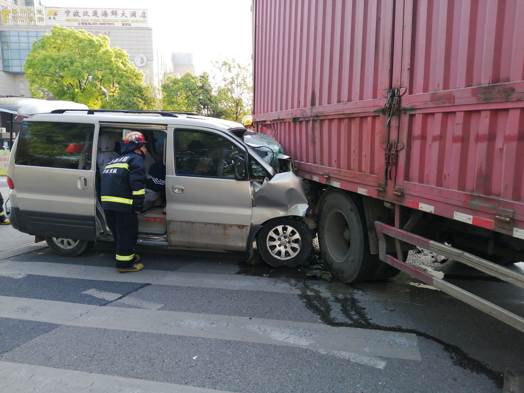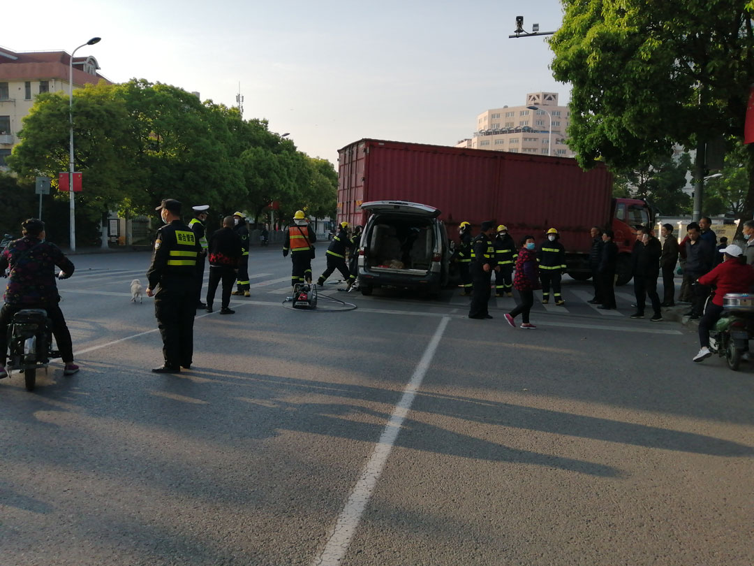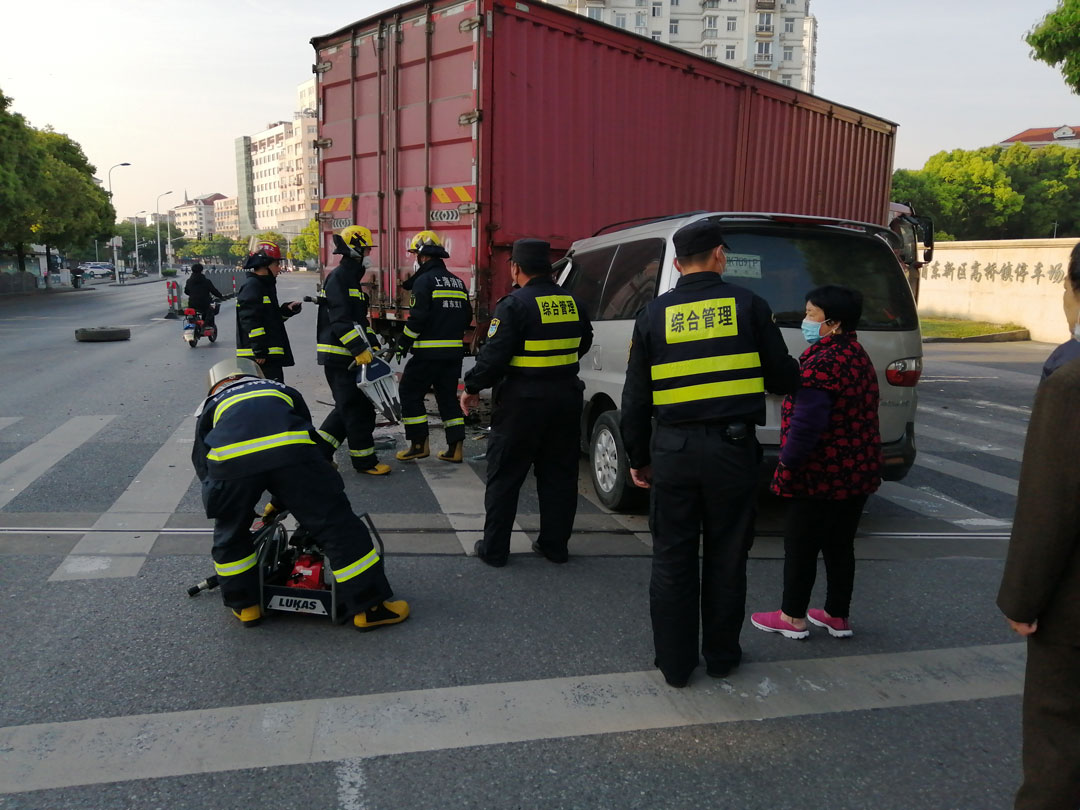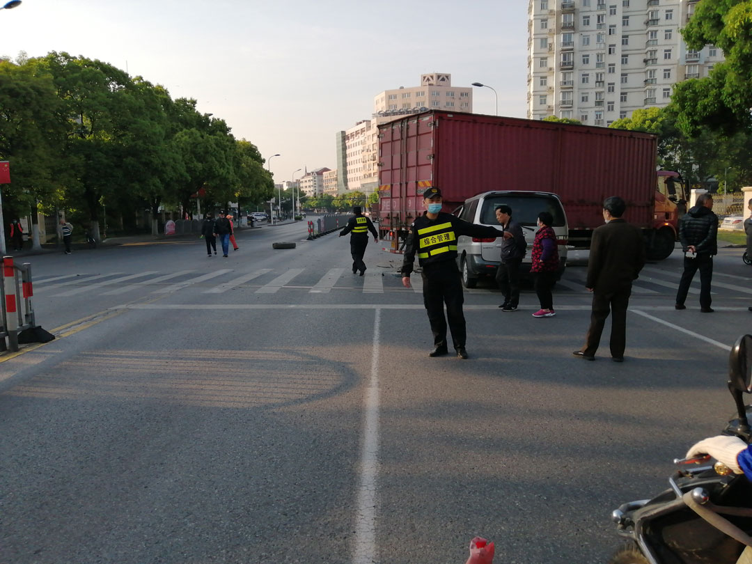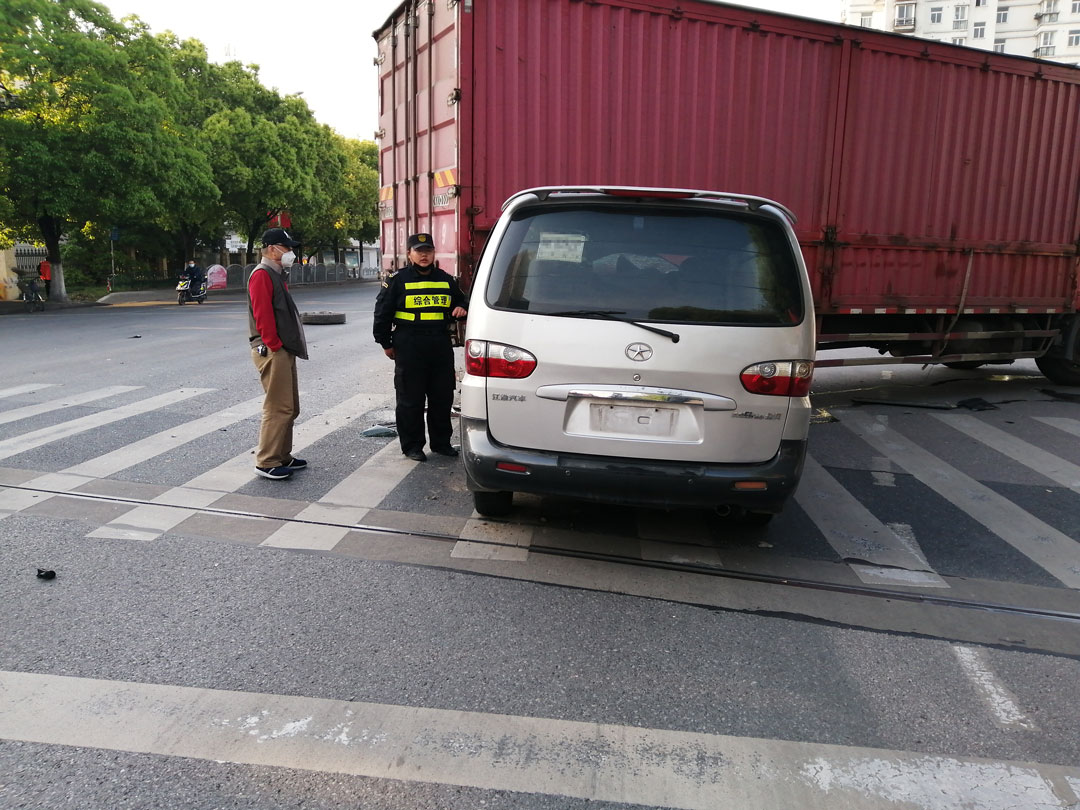 4月25日7:00左右,宗保公司駐高橋市容項目負責人王如龍帶著兩名隊員巡邏至高橋鎮(zhèn)張楊北路5657號高橋公園時,遇到一起大貨車和小型客車相撞的交通事故,小型客車的車頭受到撞擊導致嚴重變形。