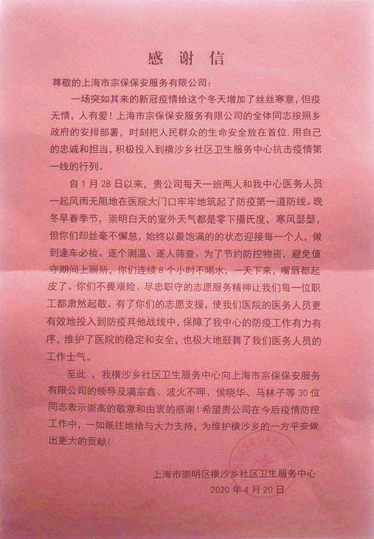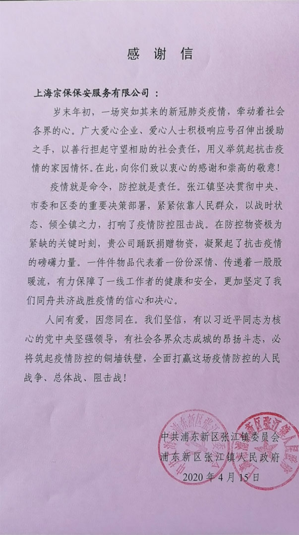 4月25日,宗保公司收到浦東新區(qū)張江鎮(zhèn)人民政府的感謝信。信中對宗保公司以善行擔(dān)起守望相助的社會責(zé)任,用義舉筑起抗擊疫情的家園情懷,表示感謝和敬意!