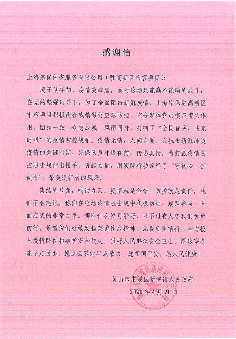 4月20日,宗保公司駐黃山市高新區(qū)市容項(xiàng)目收到黃山市屯溪區(qū)新潭鎮(zhèn)人民政府送來的一封感謝信,信中對高新區(qū)市容項(xiàng)目全體隊(duì)員在疫情防控中所做的工作表示感謝。