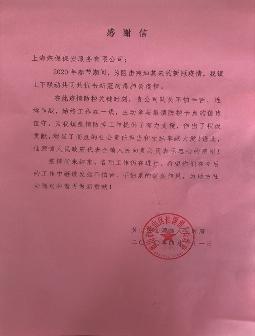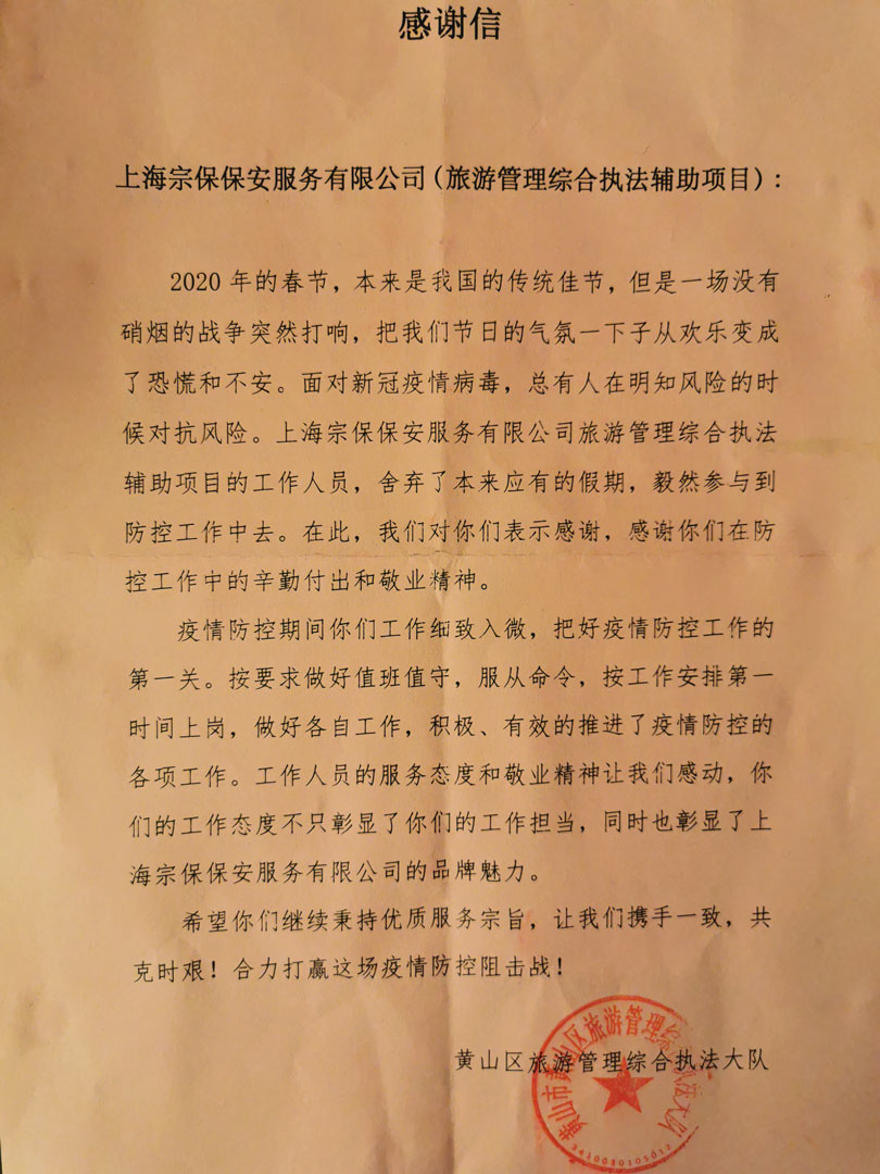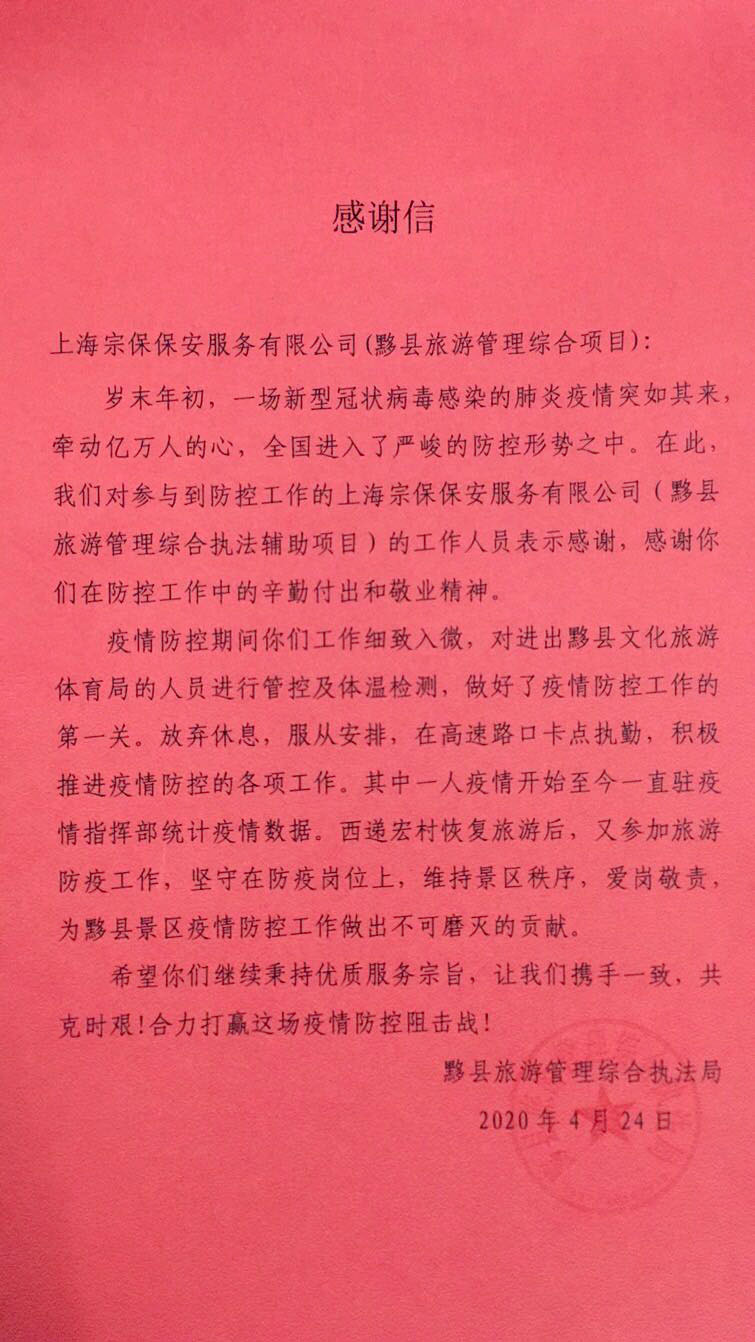4月24日,宗保公司駐黃山市黟縣旅游管理綜合項(xiàng)目收到黟縣旅游管理綜合執(zhí)法局的一封感謝信,信中對公司全體隊(duì)員在疫情防控工作中的辛勤付出和敬業(yè)精神表示感謝。