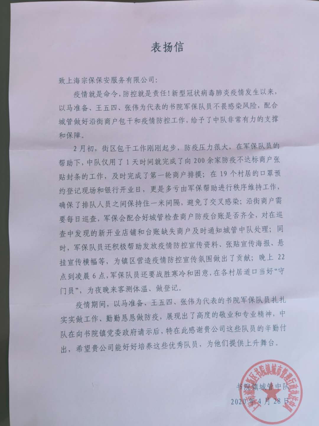 4月28日,宗保公司駐書院鎮(zhèn)市容項(xiàng)目收到書院鎮(zhèn)城管中隊(duì)中隊(duì)長王燕偉送來的一封表揚(yáng)信,信中對(duì)以馬準(zhǔn)備、王五四、張偉等為代表的書院鎮(zhèn)市容項(xiàng)目隊(duì)員,在防控新冠肺炎疫情中配合城管中隊(duì)所做的工作,提供的有力支撐和保障提出表揚(yáng)。