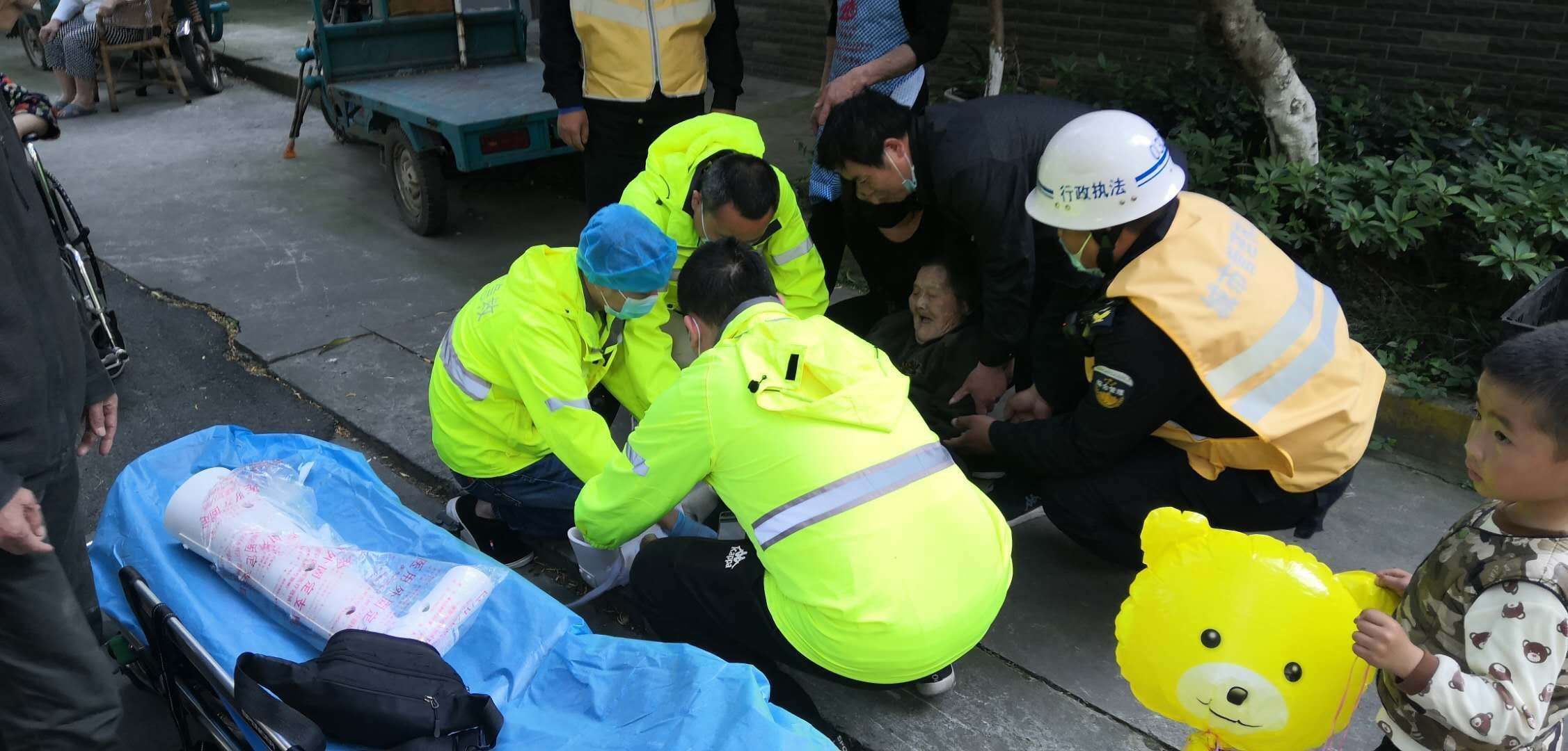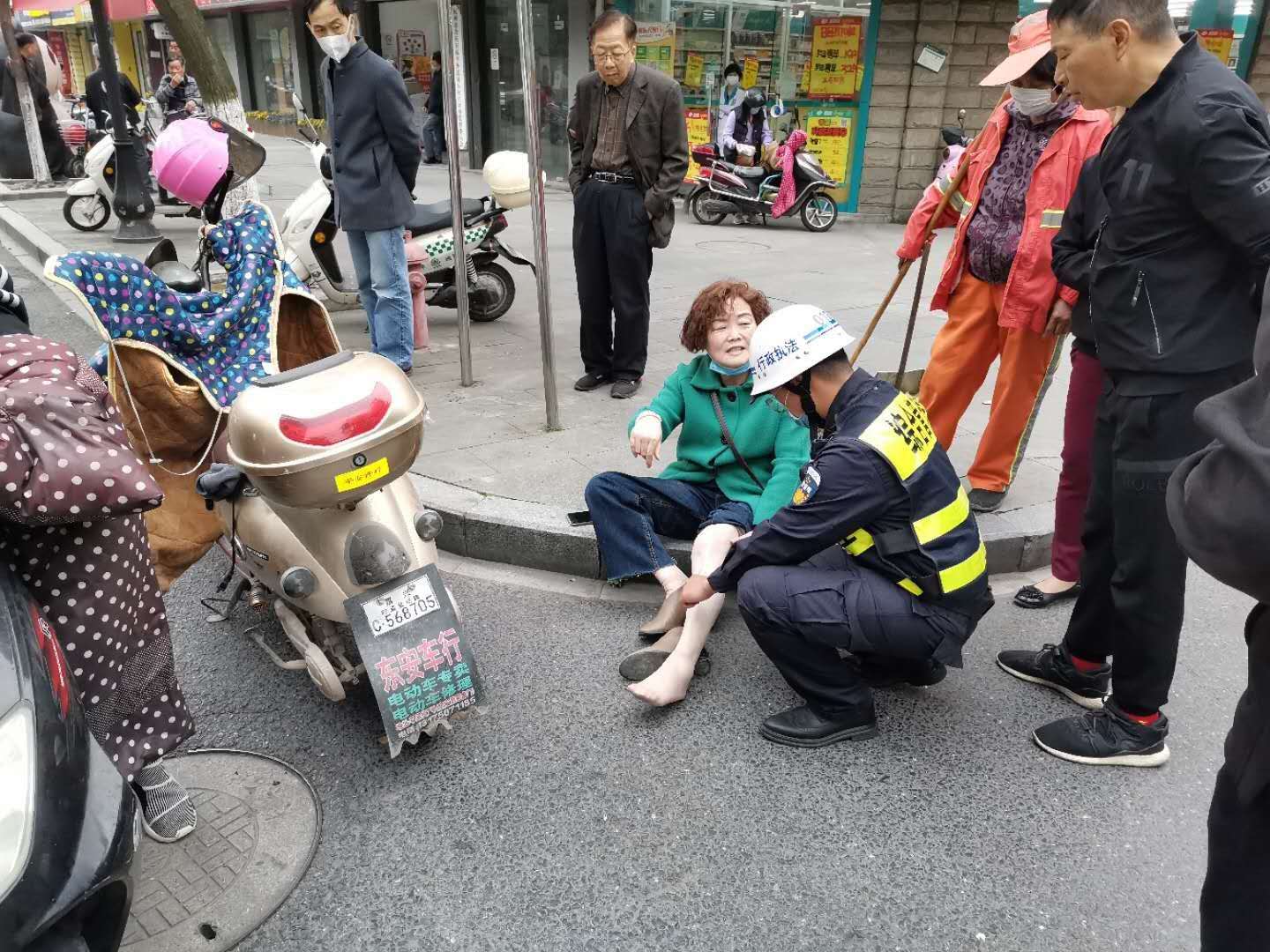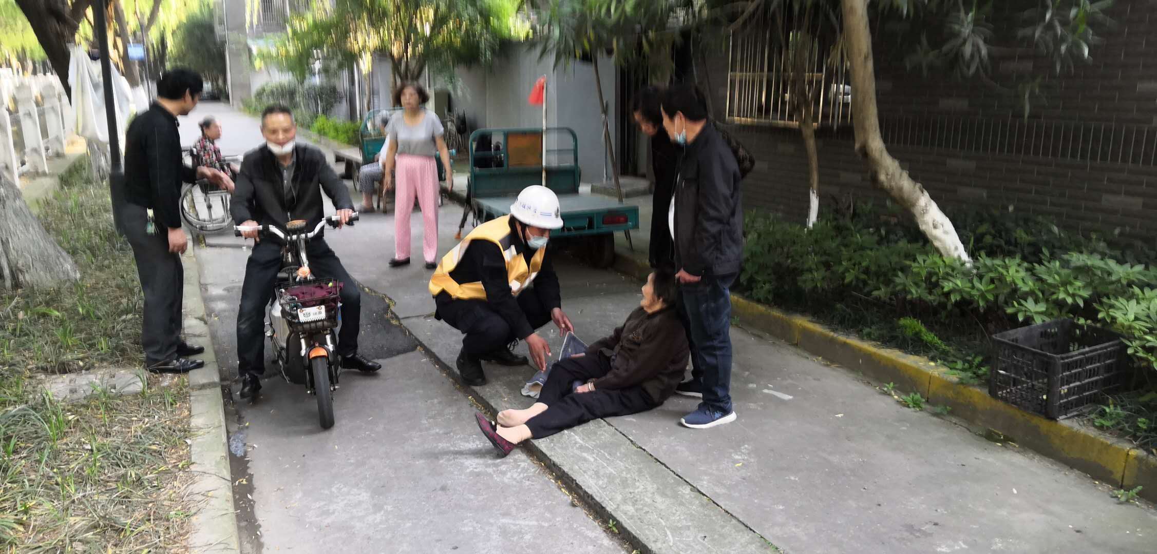 4月29日16:30,臨平街道九曲營(yíng)路與梅堰路口,一位外出遛彎的老太太突然摔倒在地,腿部傷勢(shì)過重?zé)o法起身。民泰公司駐臨平市容項(xiàng)目隊(duì)員張艮振正好巡邏至此,立馬跑過去查看老人傷勢(shì),安慰老人情緒,并撥打120急救電話。