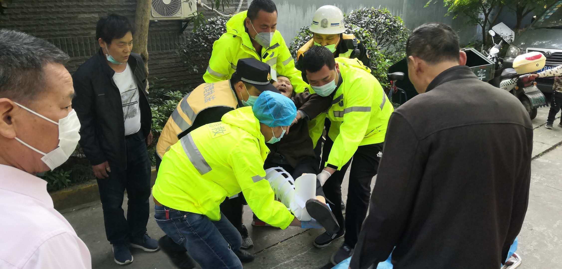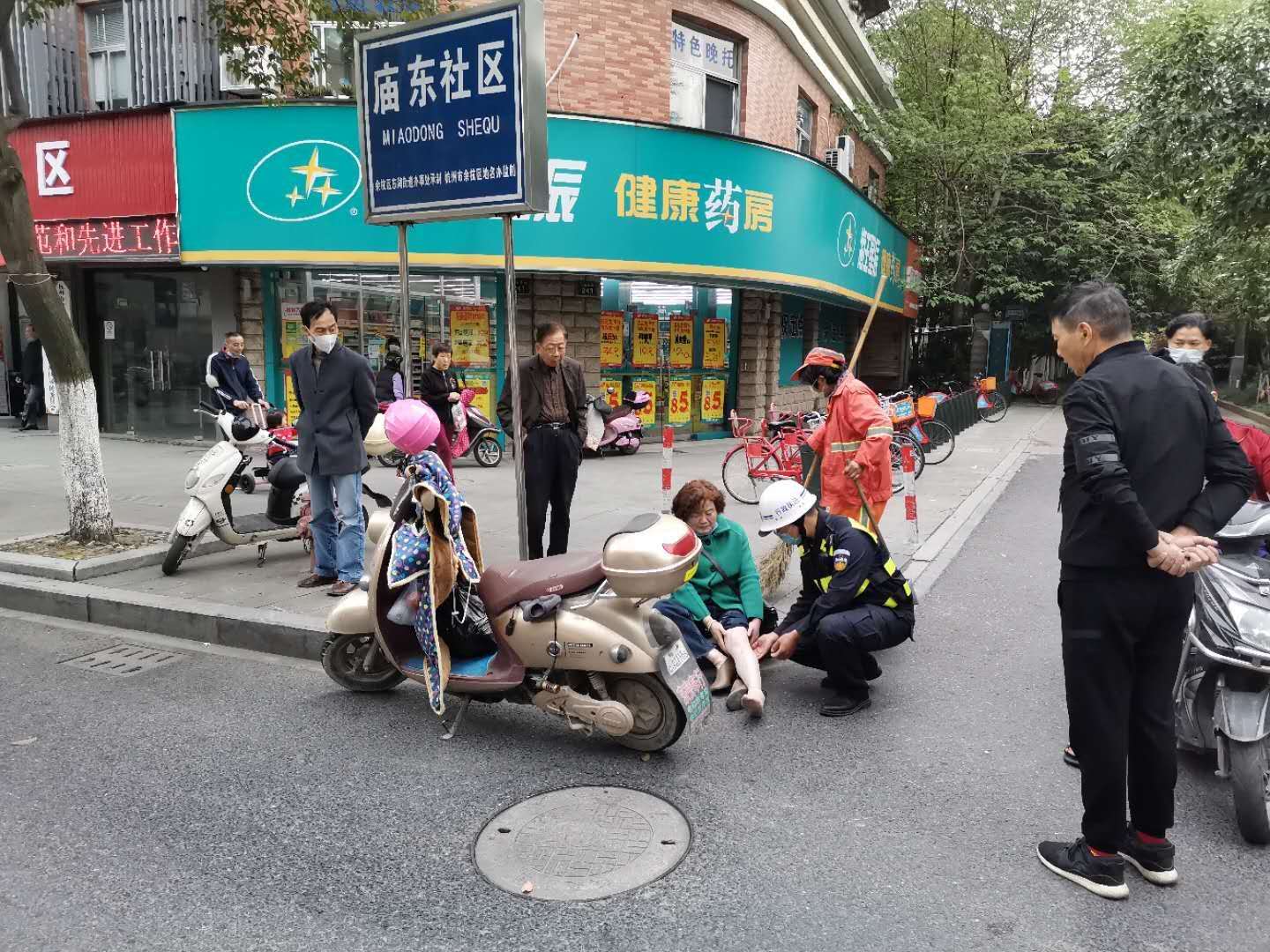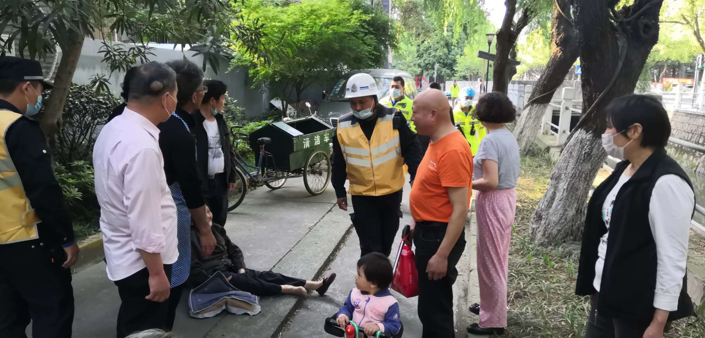 4月29日16:30,臨平街道九曲營(yíng)路與梅堰路口,一位外出遛彎的老太太突然摔倒在地,腿部傷勢(shì)過重?zé)o法起身。民泰公司駐臨平市容項(xiàng)目隊(duì)員張艮振正好巡邏至此,立馬跑過去查看老人傷勢(shì),安慰老人情緒,并撥打120急救電話。