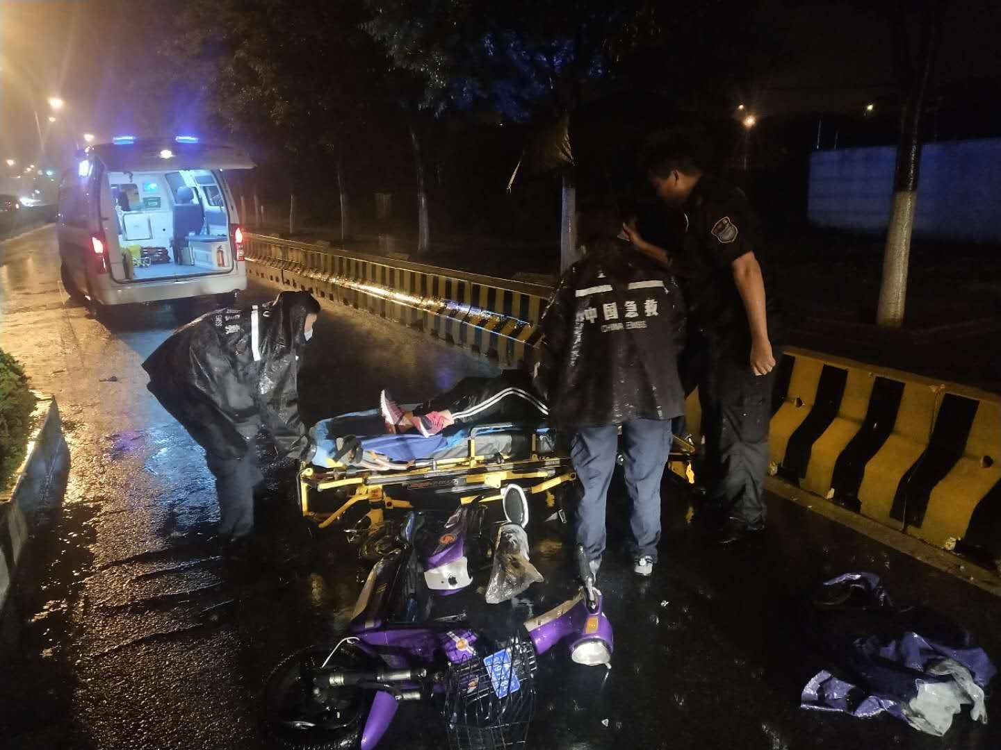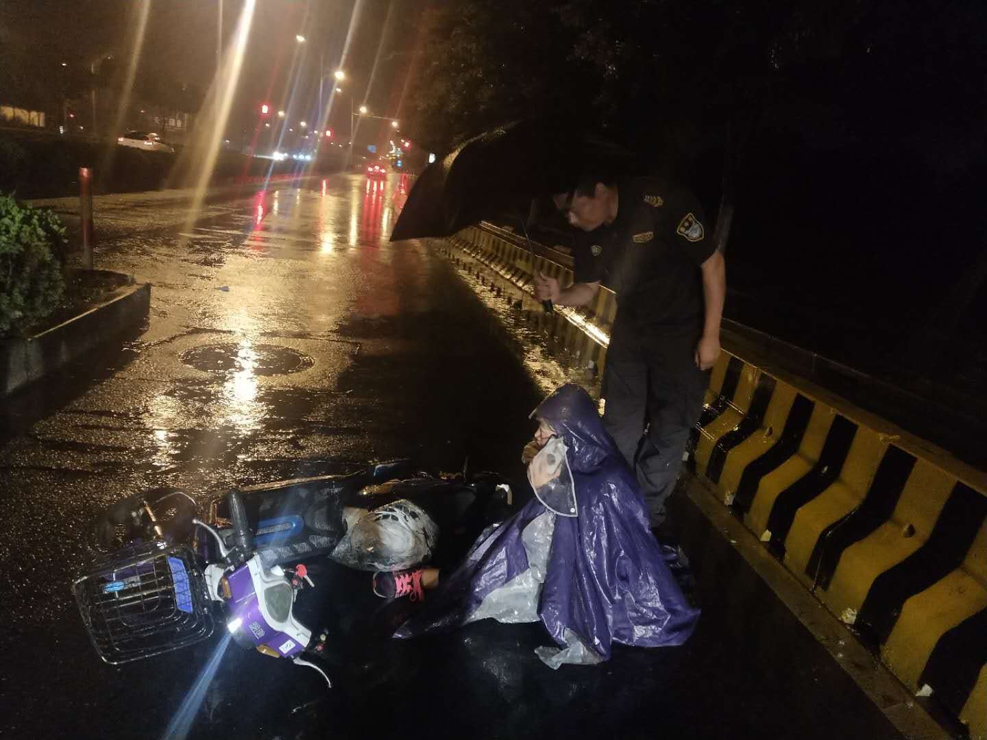 當晚22:30,大雨傾盆,能見度較差。李杰巡邏到申江路周祝公路時,發(fā)現一輛電瓶車摔倒在地,一名女子躺在雨水中無法動彈。