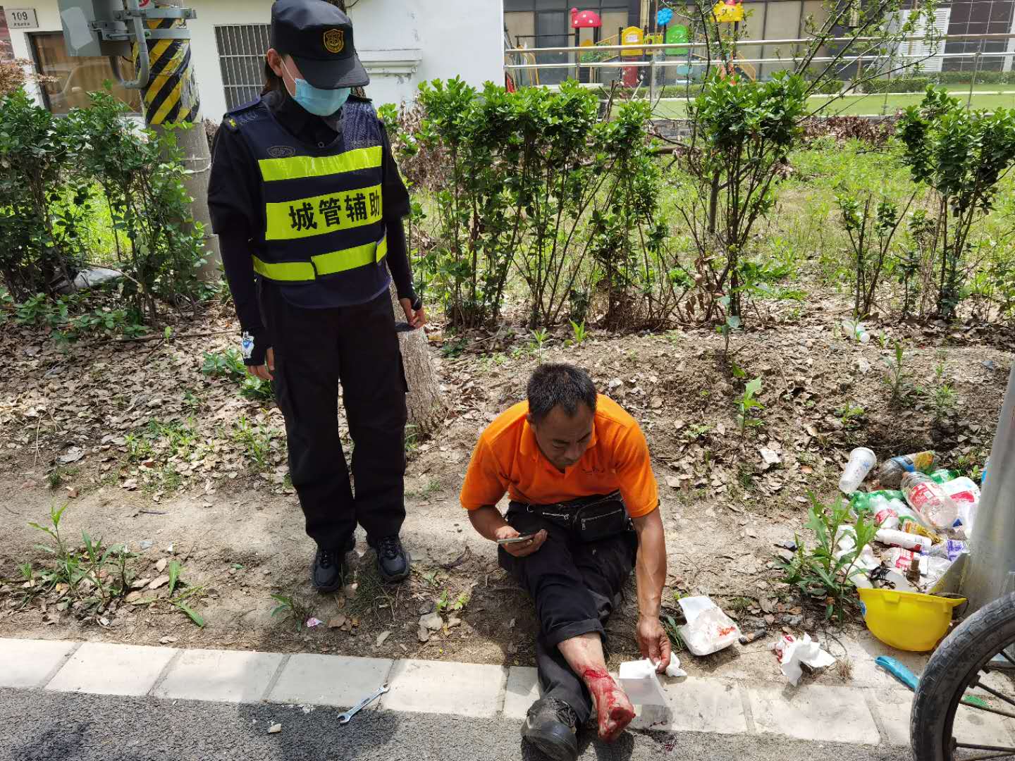 宗保公司駐周浦市容五組隊員吳吉喆剛好巡邏至此,急忙上前查看,老人身體多處受傷,且傷勢嚴(yán)重流血不止。原來是因為三輪車搭載過重,老人力氣不足,無法控制車輛,才導(dǎo)致事故的發(fā)生。小吳把老人攙扶起身,撥打120急救電話,并緊急通知附近崗位執(zhí)勤隊員前來支援。