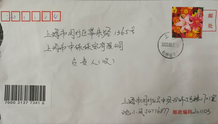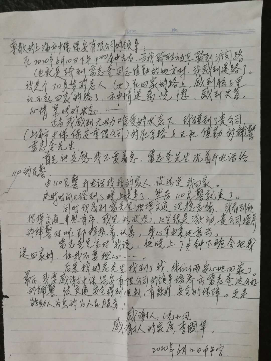 6月12日,宗保公司駐閔行莘莊梅隴交通輔警項(xiàng)目隊(duì)員雷志奎收到市民沈小鳳老人家屬寄來的一封感謝信。