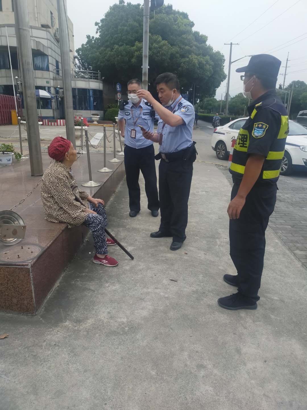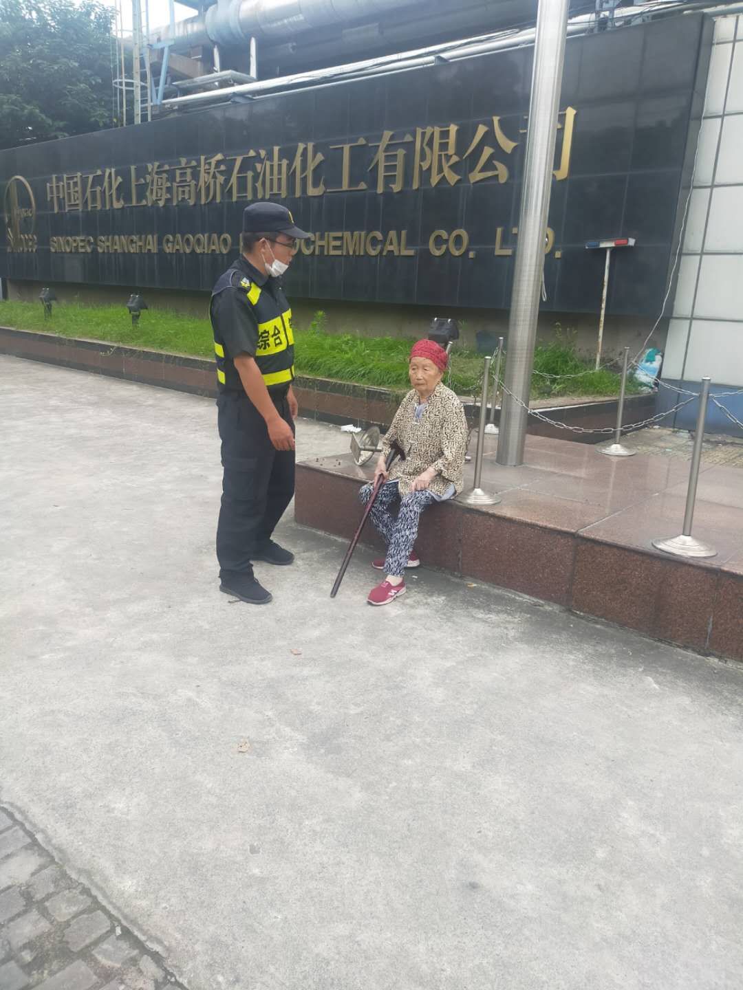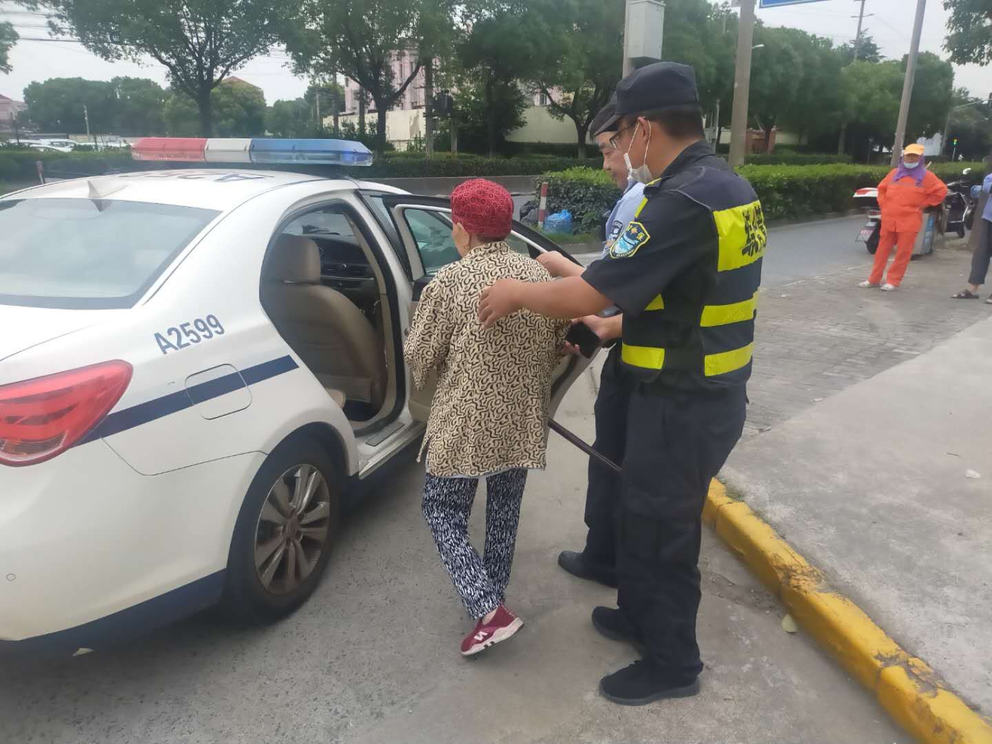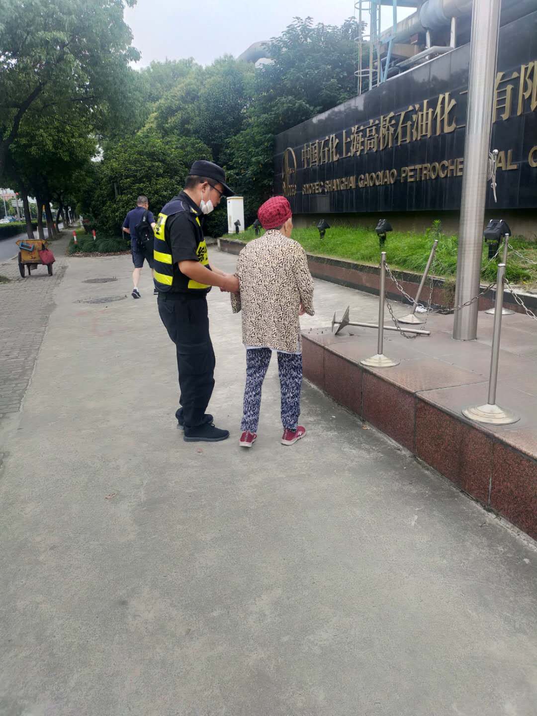 7月7日18:00,宗保公司駐高橋市容項目隊員王金齊、李少秋巡邏至浦東北路花山路時,看到一位老阿姨在機(jī)動車道上徘徊,眼神還有些許驚慌。