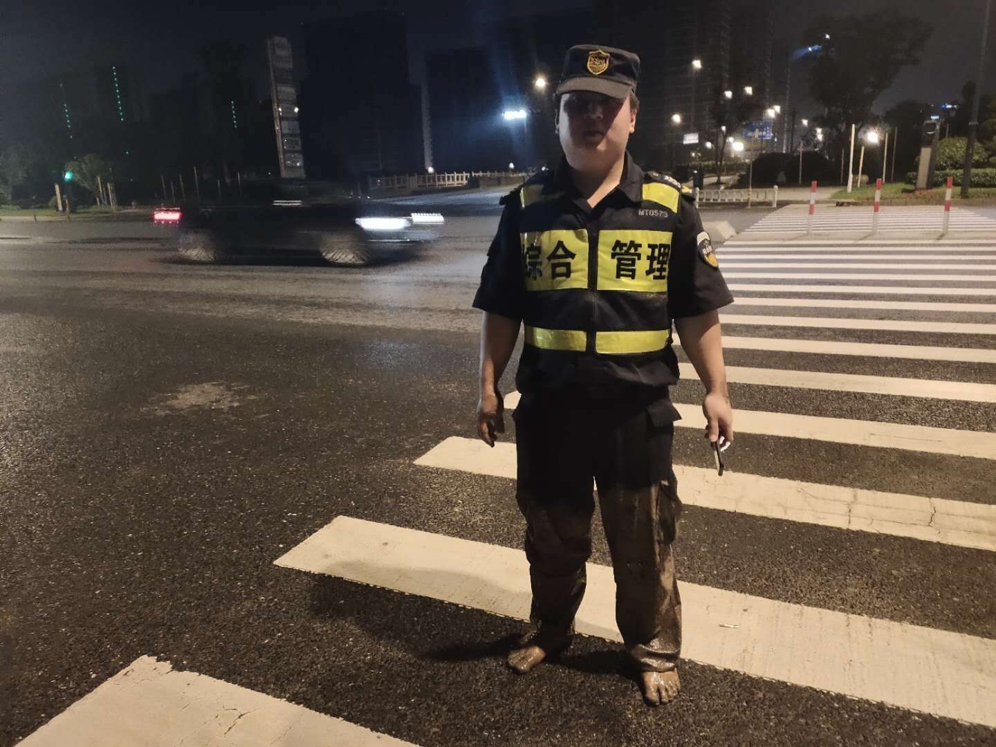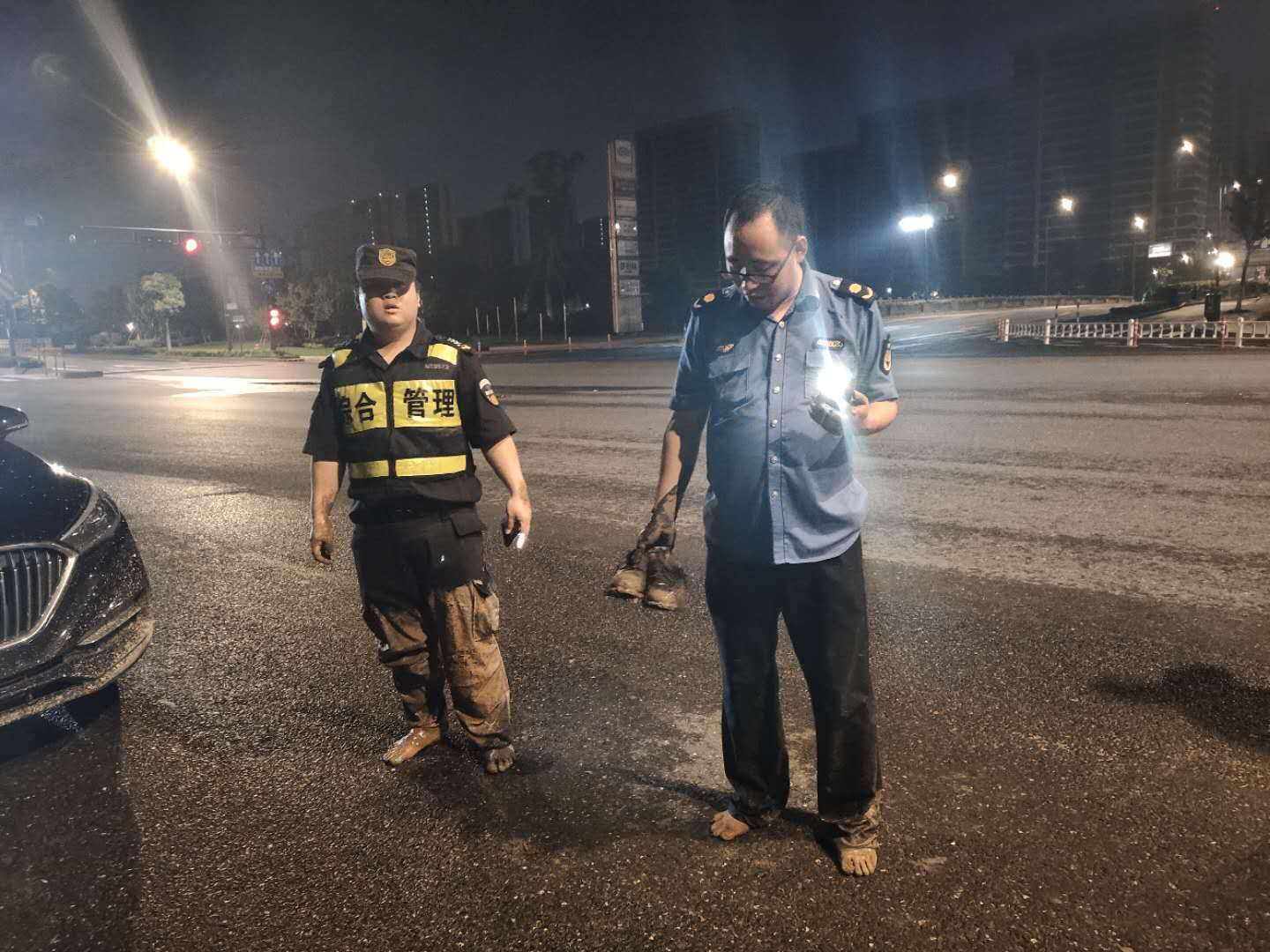 當(dāng)天凌晨1點(diǎn),該項(xiàng)目夜班隊(duì)員溫東興、蔣超、王園召在巡查期間接到舉報電話,有人在附近路邊傾倒工程渣土。三人立即將此事匯報城管中隊(duì)領(lǐng)導(dǎo),在相關(guān)領(lǐng)導(dǎo)的帶領(lǐng)下隨即趕赴事發(fā)現(xiàn)場,發(fā)現(xiàn)當(dāng)事人正準(zhǔn)備駕車逃離。由于近期雨水多,路面嚴(yán)重泥濘,違規(guī)渣土車行駛緩慢。三名隊(duì)員立刻下車,不顧泥濘,不管滿身泥漿,鞋子陷入泥中就赤腳,深一腳淺一腳地奮力追趕,最終在三人的努力下,成功地將涉事人員和車輛控制。